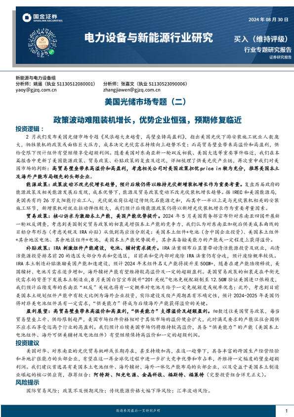 【国金证券】【20240830】电力设备与新能源行业研究:美国光储市场专题(二)-政策波动难阻装机增长,优势企业恒强,预期修复临近-28页
