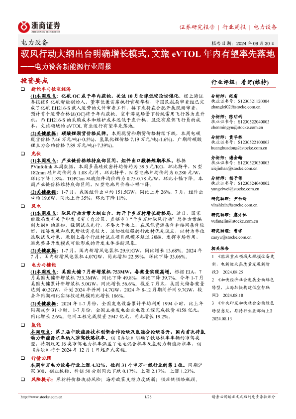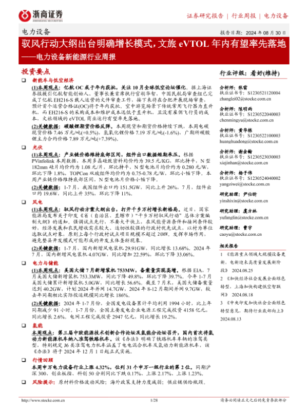 【浙商证券】【20240830】电力设备新能源行业周报:驭风行动大纲出台明确增长模式,文旅eVTOL年内有望率先落地-28页