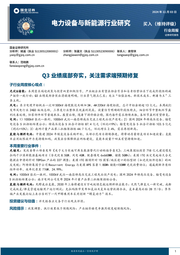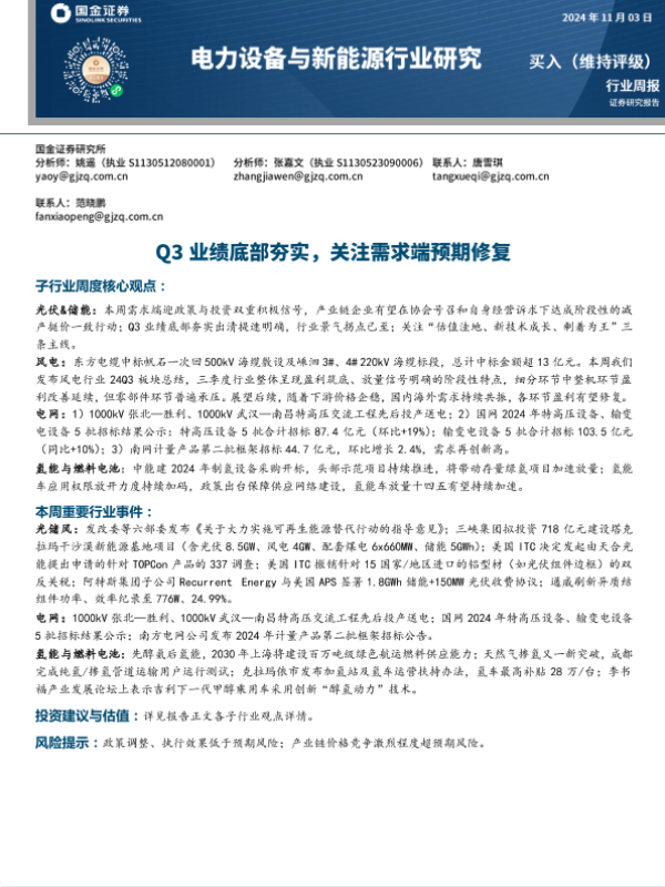 【国金证券】【20241103】20241103-国金证券-电力设备与新能源行业周报:Q3业绩底部夯实,关注需求端预期修复-10页