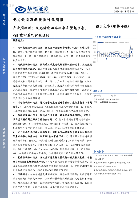 【华福证券】【20241103】电力设备及新能源行业周报:产业周跟踪,风光储电动车旺季有望超预期,PMI重回景气扩张区间-19页