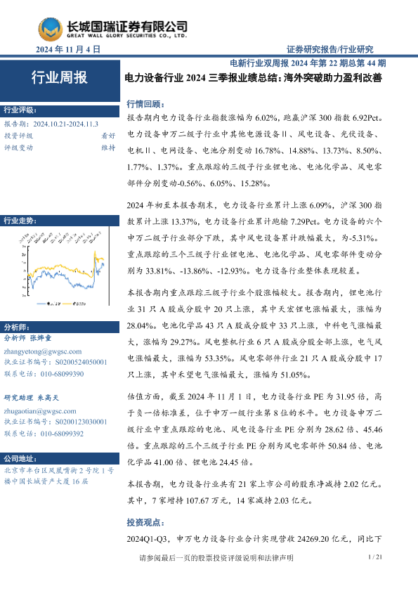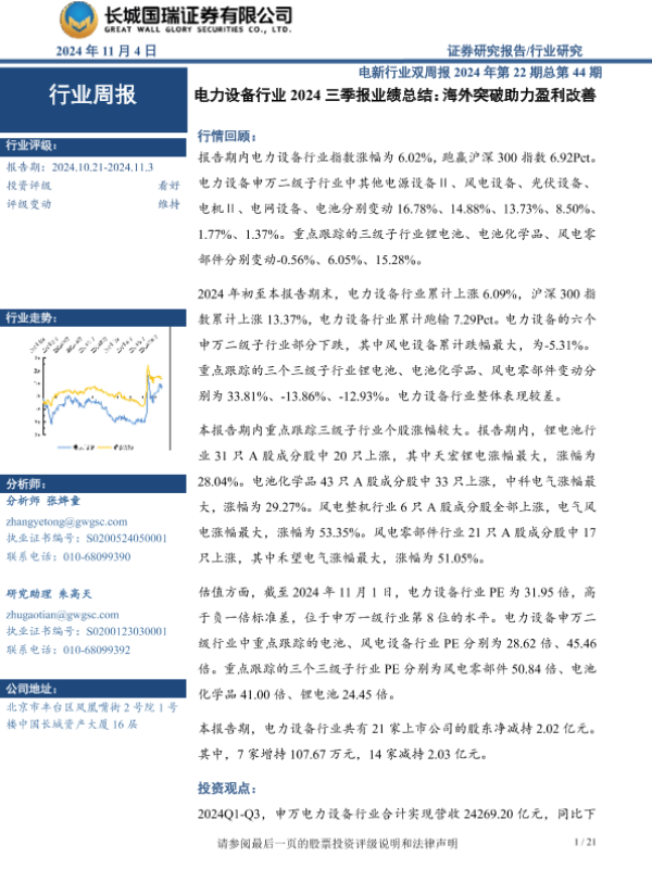 【长城国瑞证券】【20241104】电力设备行业2024三季报业绩总结:海外突破助力盈利改善-21页