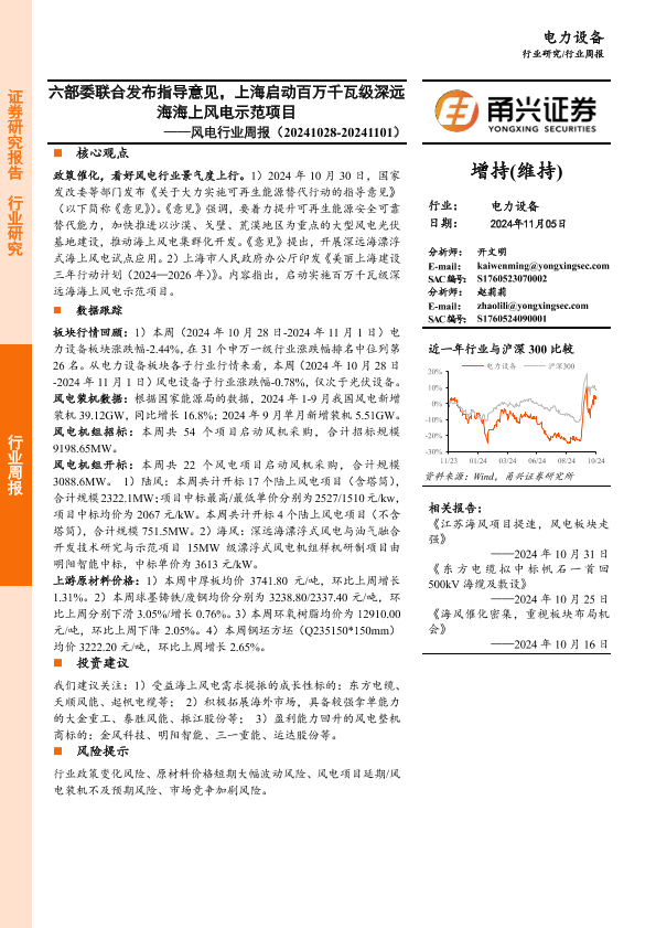 【甬兴证券】【20241105】20241105-甬兴证券-风电行业周报:六部委联合发布指导意见,上海启动百万千瓦级深远海海上风电示范项目-14页