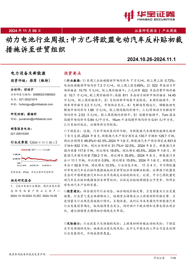 【华宝证券】【20241106】动力电池行业周报:中方已将欧盟电动汽车反补贴初裁措施诉至世贸组织-16页