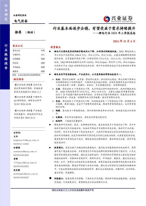【兴业证券】【20241106】行业基本面逐步企稳,有望受益于需求持续提升——锂电行业2024年三季报总结-18页