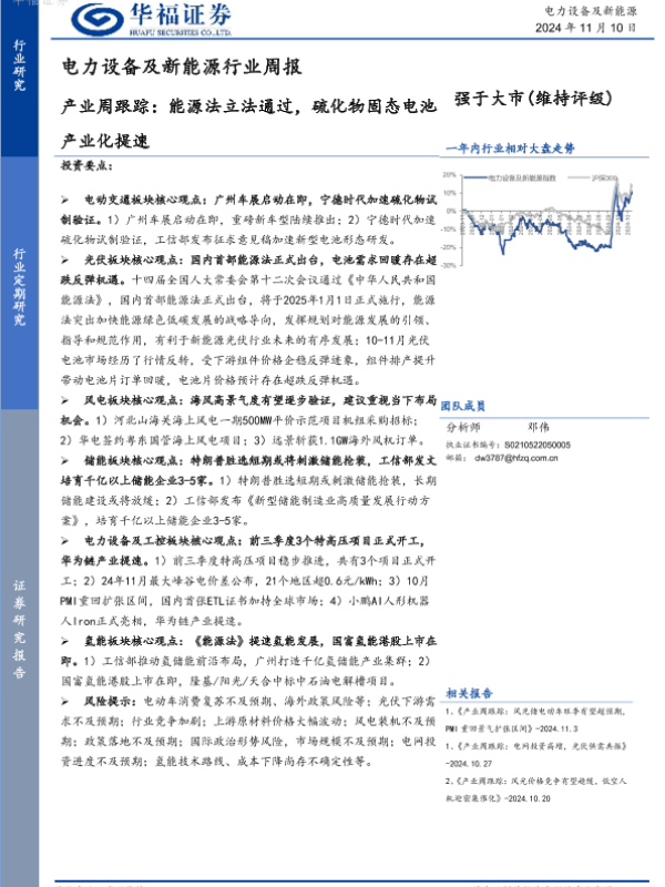 【华福证券】【20241110】电力设备及新能源行业周报:产业周跟踪,能源法立法通过,硫化物固态电池产业化提速-16页