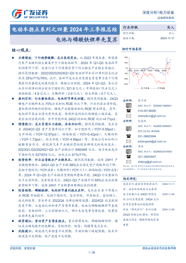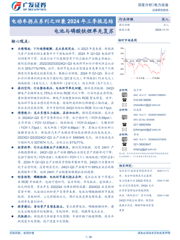 【广发证券】【20241111】电动车拐点系列之四兼2024年三季报总结:电池与磷酸铁锂率先复苏-26页