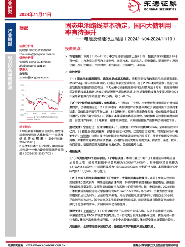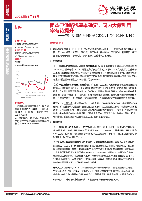 【东海证券】【20241111】电池及储能行业周报:固态电池路线基本确定,国内大储利用率有待提升-13页