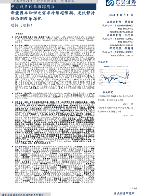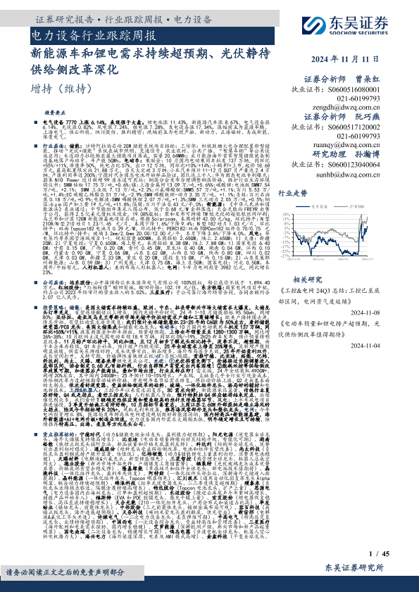 【东吴证券】【20241111】电力设备行业跟踪周报:新能源车和锂电需求持续超预期、光伏静待供给侧改革深化-45页