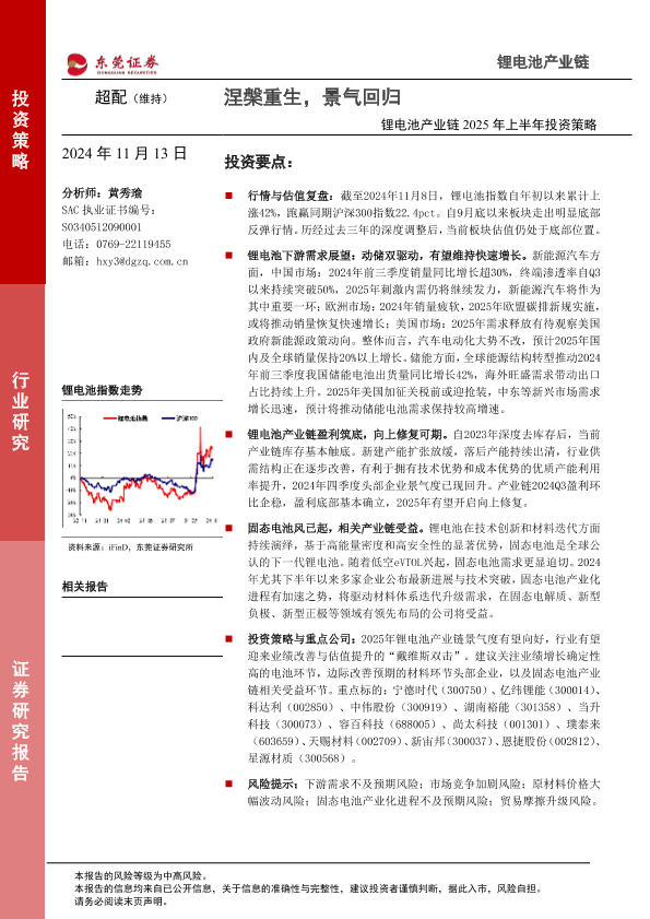 【东莞证券】【20241113】锂电池产业链2025年上半年投资策略:涅盘重生,景气回归-27页
