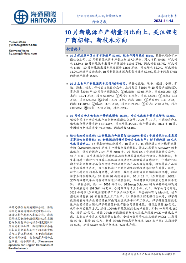 【海通国际】【20241114】20241114-海通国际-新能源板块行业月报:10月新能源车产销量同比向上,关注锂电厂商招标、新技术方向-11页