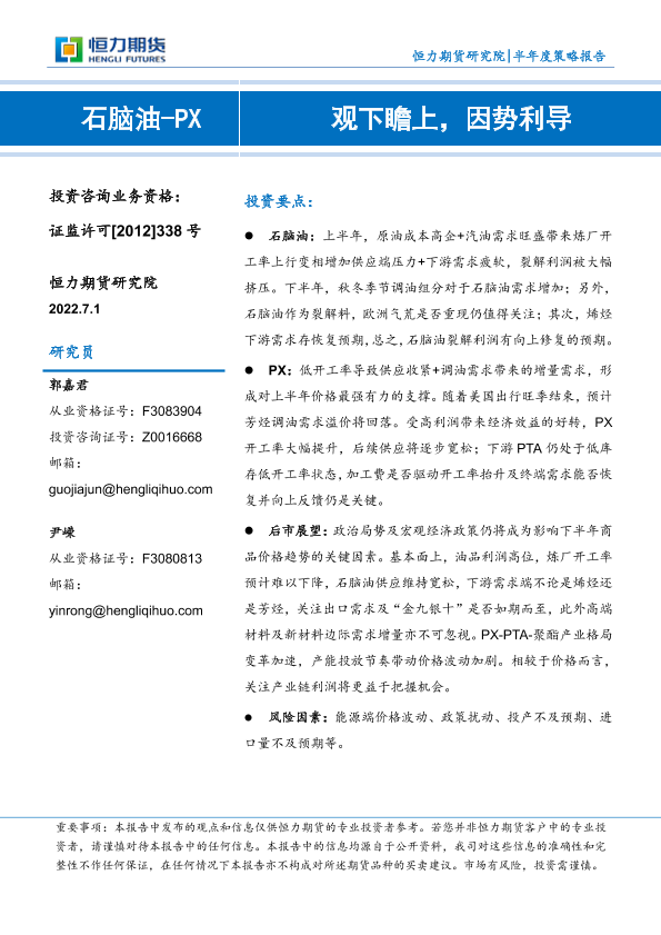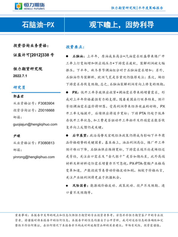 【恒力期货】【20220701】石脑油_PX半年度策略报告:观下瞻上,因势利导-16页
