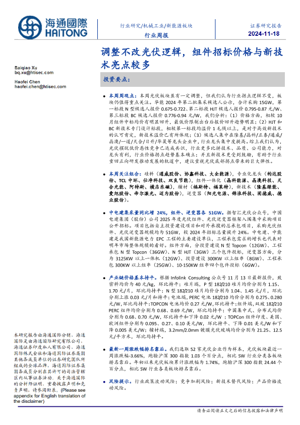 【海通国际】【20241118】20241118-海通国际-新能源板块行业周报:调整不改光伏逻辑,组件招标价格与新技术亮点较多-13页