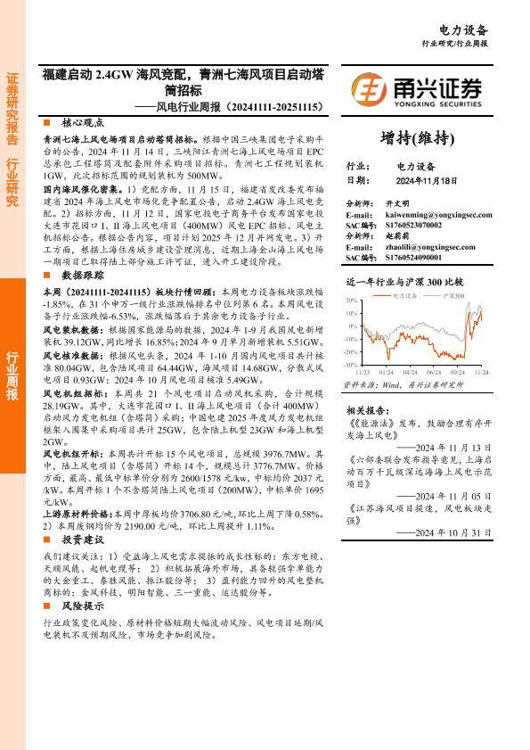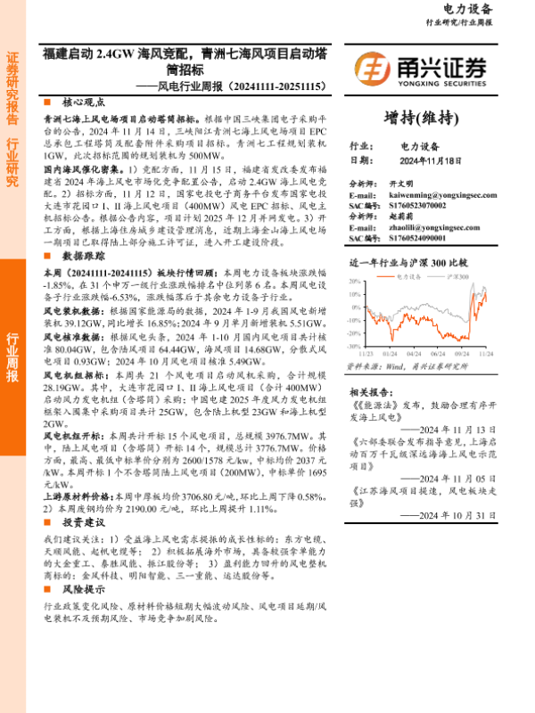 【甬兴证券】【20241118】20241118-甬兴证券-风电行业周报:福建启动2.4GW海风竞配,青洲七海风项目启动塔筒招标-14页