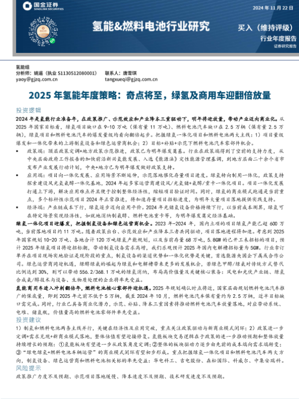 【国金证券】【20241122】2025年氢能年度策略:奇点将至,绿氢及商用车迎翻倍放量-30页
