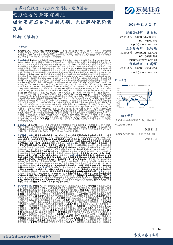【东吴证券】【20241124】电力设备行业跟踪周报:锂电供需好转开启新周期、光伏静待供给侧改革-44页