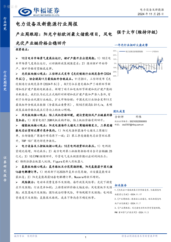 【华福证券】【20241125】电力设备及新能源行业周报:产业周跟踪,阳光中标欧洲最大储能项目,风电光伏产业链价格企稳回升-15页