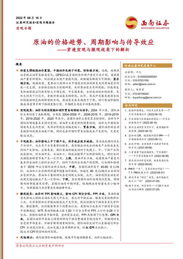 【西南证券】【20220816】穿透宏观与微观视角下的解析:原油的价格趋势、周期影响与传导效应-16页