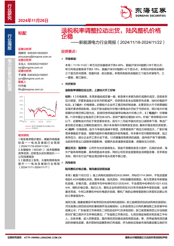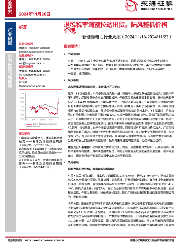【东海证券】【20241126】20241126-东海证券-新能源电力行业周报:退税税率调整拉动出货,陆风整机价格企稳-15页
