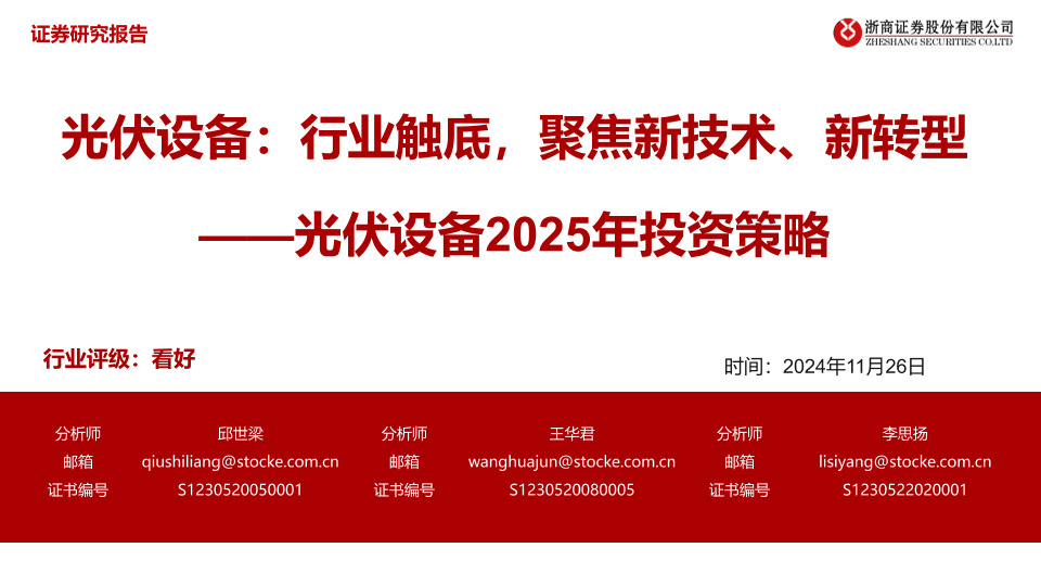【浙商证券】【20241126】光伏设备2025年投资策略:光伏设备:行业触底,聚焦新技术、新转型-40页