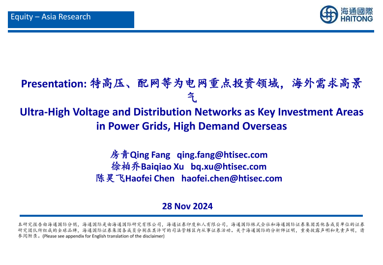 【海通国际】【20241128】特高压、配网等为电网重点投资领域,海外需求高景气-49页