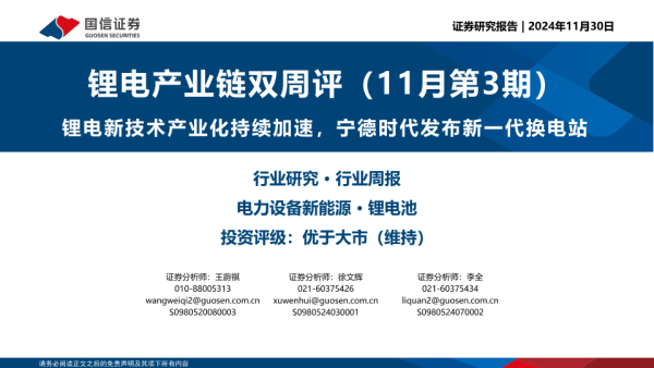 【国信证券】【20241130】锂电产业链双周评(11月第3期):锂电新技术产业化持续加速,宁德时代发布新一代换电站-20页