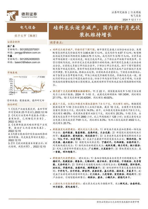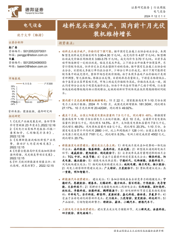 【德邦证券】【20241201】德邦证券-电气设备行业周报:硅料龙头逐步减产,国内前十月光伏装机维持增长-14页