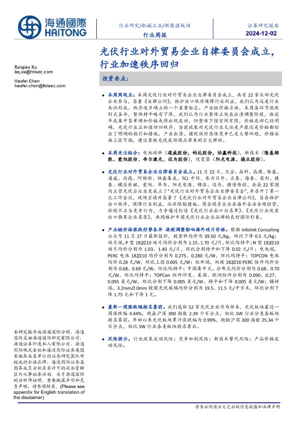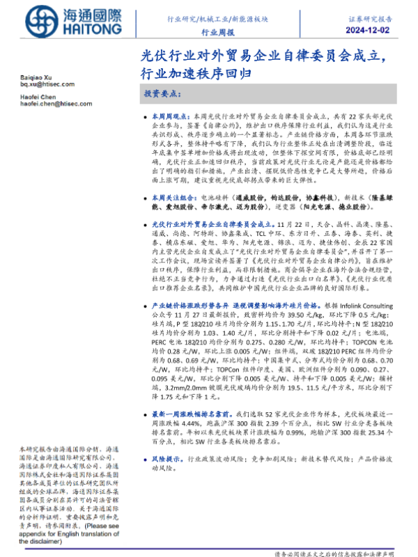 【海通国际】【20241202】20241202-海通国际-新能源板块行业周报:光伏行业对外贸易企业自律委员会成立,行业加速秩序回归-13页