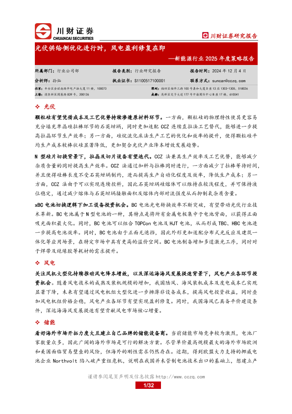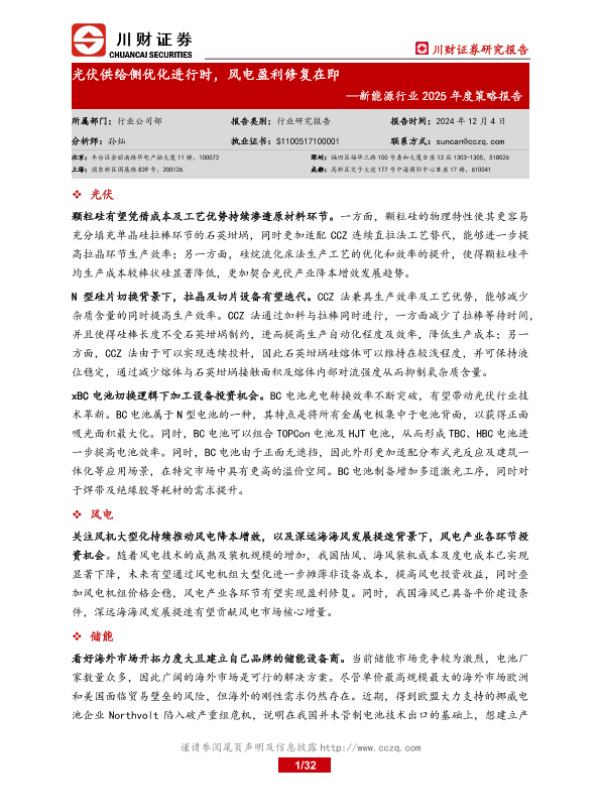 【川财证券】【20241204】20241204-川财证券-新能源行业2025年度策略报告:光伏供给侧优化进行时,风电盈利修复在即-32页