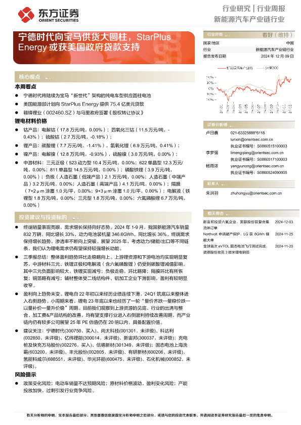 【东方证券】【20241209】20241209-东方证券-新能源汽车产业链行业周报:宁德时代向宝马供货大圆柱,StarPlus Energy或获美国政府贷款支持-13页