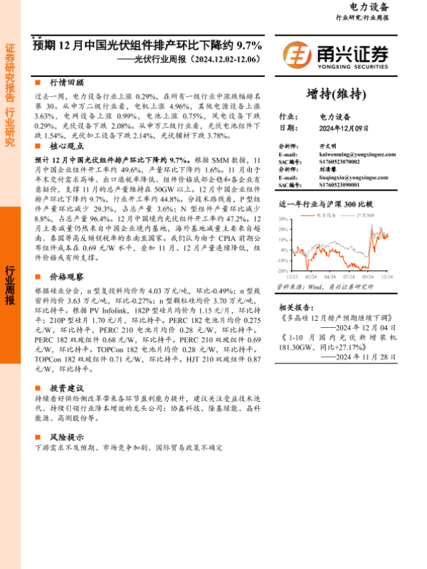 【甬兴证券】【20241209】预期12月中国光伏组件排产环比下降约9.7%-12页