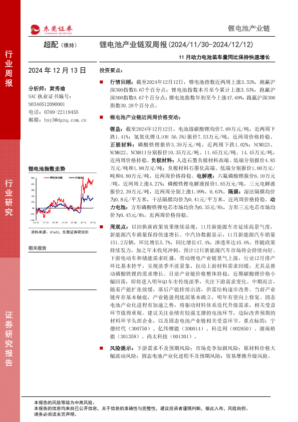 【东莞证券】【20241213】锂电池产业链双周报:11月动力电池装车量同比保持快速增长-13页
