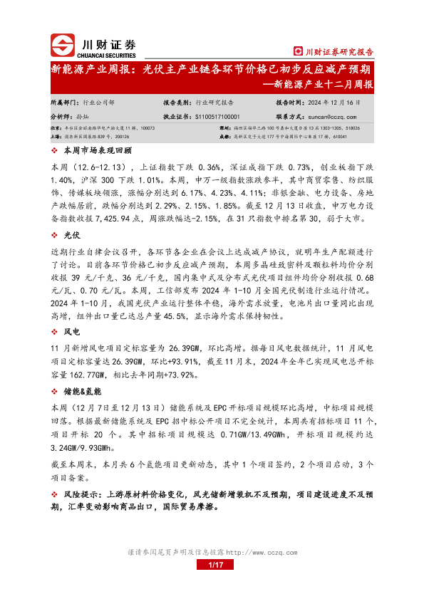 【川财证券】【20241216】新能源产业十二月周报:光伏主产业链各环节价格已初步反应减产预期-17页