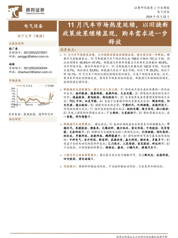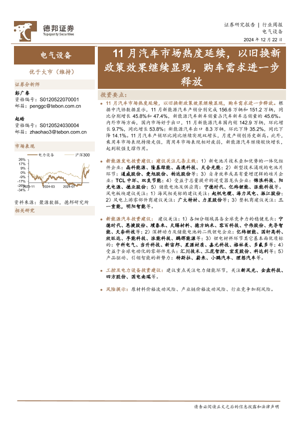【德邦证券】【20241222】20241222-德邦证券-电气设备行业周报:11月汽车市场热度延续,以旧换新政策效果继续显现,购车需求进一步释放-10页