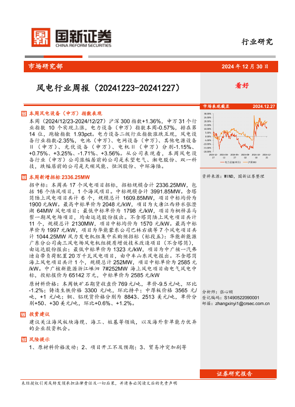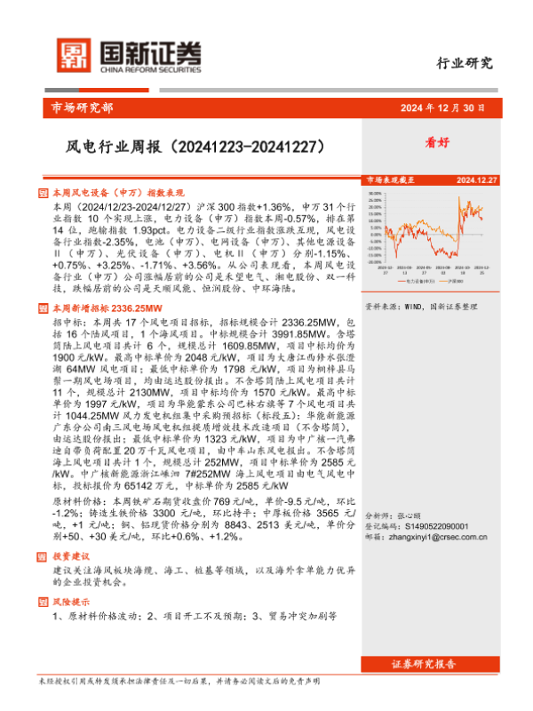 原材料价格 市场表现 投资建议 招标情况 风电设备