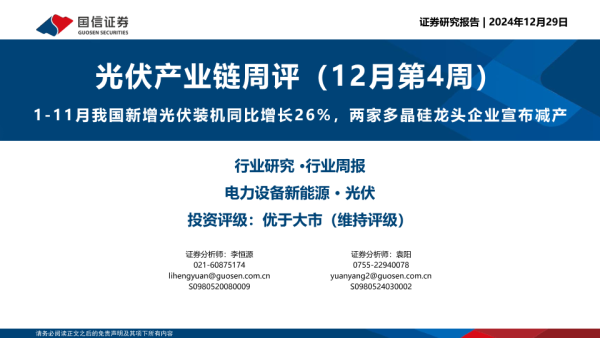 【国信证券】【20241229】20241229-国信证券-光伏产业链周评(12月第4周):1-11月我国新增光伏装机同比增长26%,两家多晶硅龙头企业宣布减产-18页