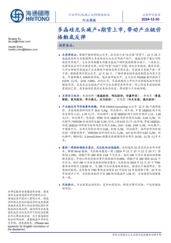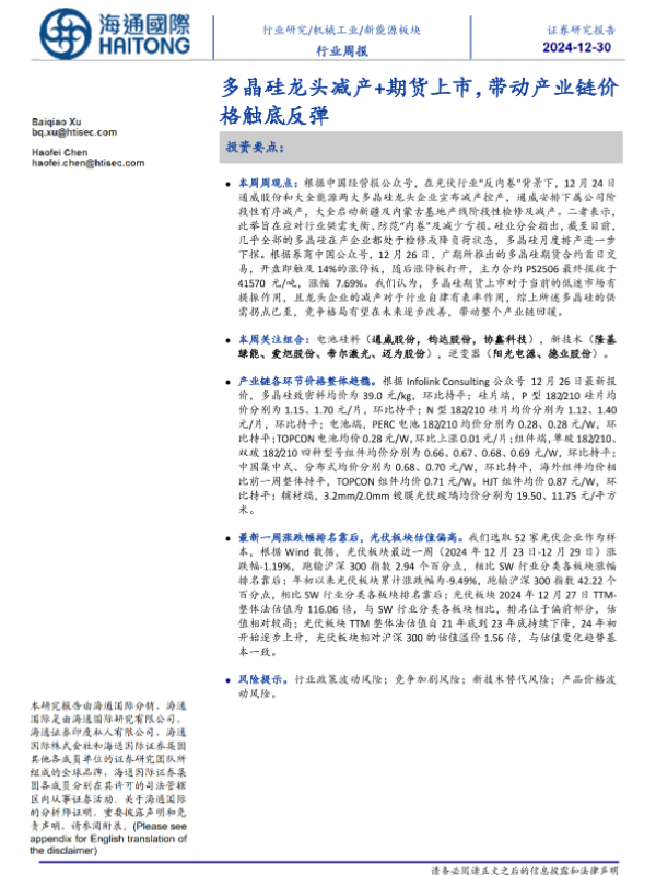 【海通国际】【20241230】20241230-海通国际-新能源板块行业周报:多晶硅龙头减产+期货上市,带动产业链价格触底反弹-13页