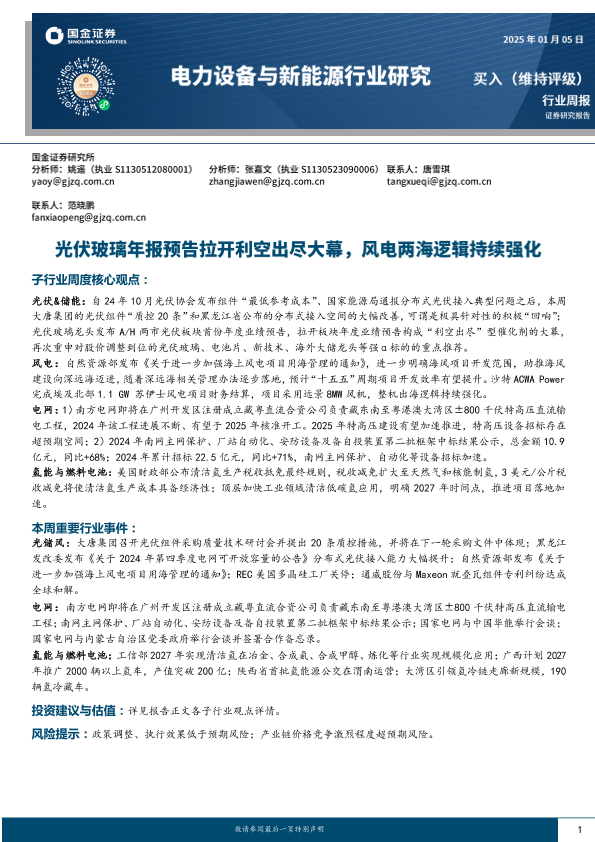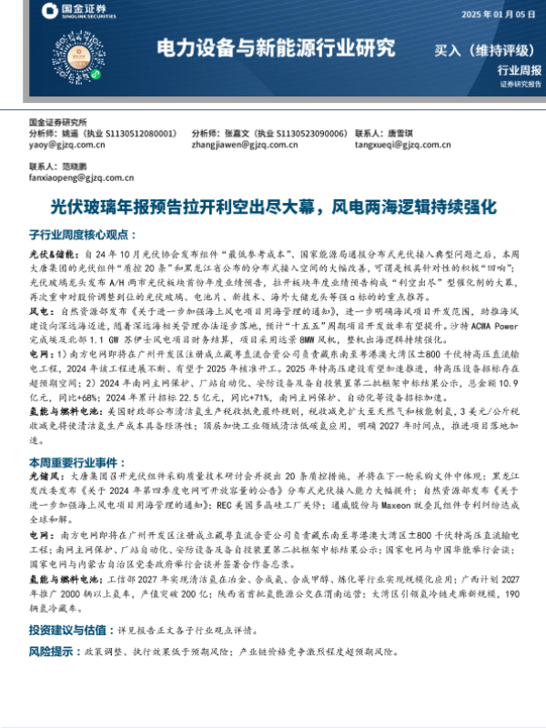 【国金证券】【20250105】电力设备与新能源行业研究:光伏玻璃年报预告拉开利空出尽大幕,风电两海逻辑持续强化-10页