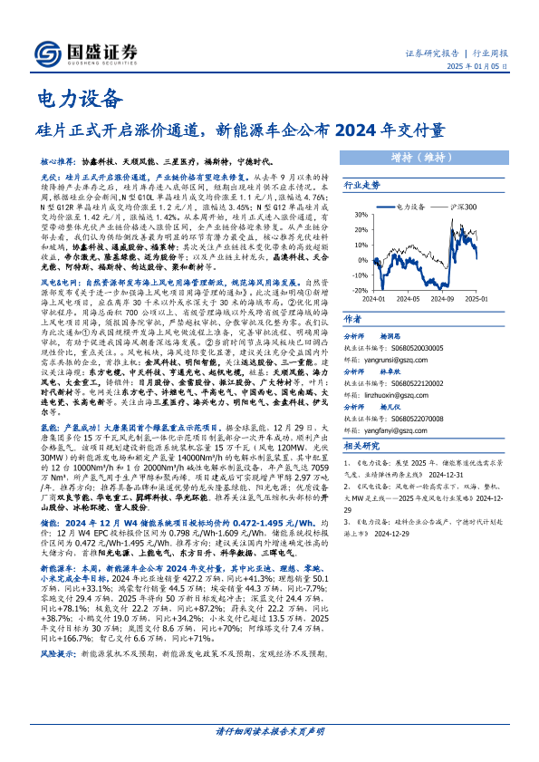 【国盛证券】【20250105】电力设备行业周报:硅片正式开启涨价通道,新能源车企公布2024年交付量-17页