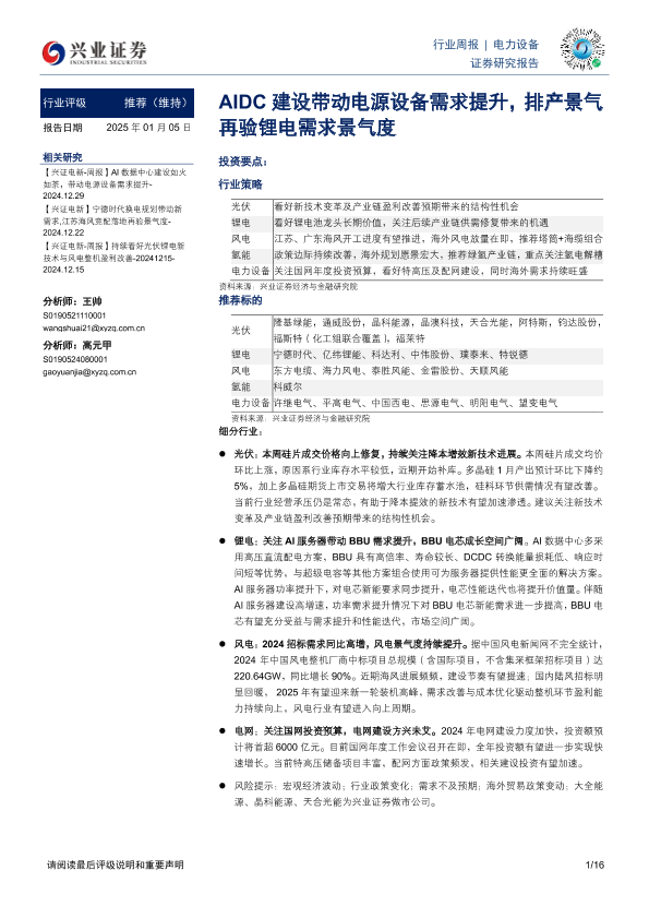 【兴业证券】【20250105】20250105-兴业证券-电力设备行业周报:AIDC建设带动电源设备需求提升,排产景气再验锂电需求景气度-16页
