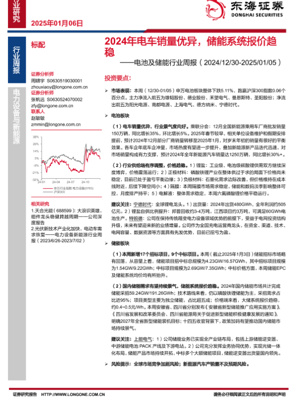【东海证券】【20250106】2024年电车销量优异,储能系统报价趋稳-12页