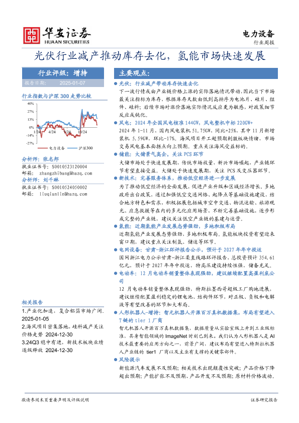 【华安证券】【20250107】电力设备行业周报:光伏行业减产推动库存去化,氢能市场快速发展-16页