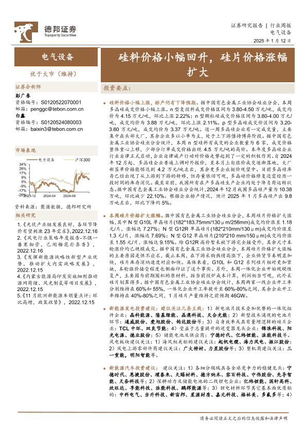 【德邦证券】【20250112】德邦证券-电气设备行业周报:硅料价格小幅回升,硅片价格涨幅扩大-14页