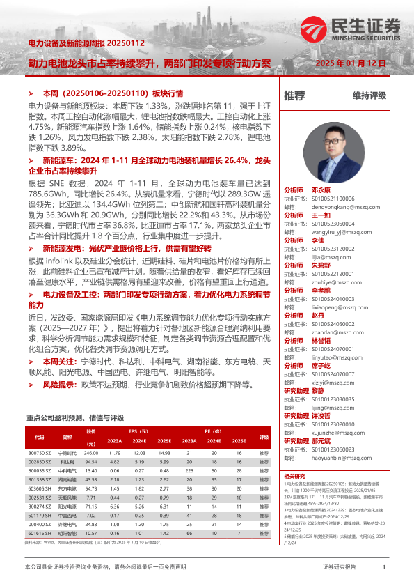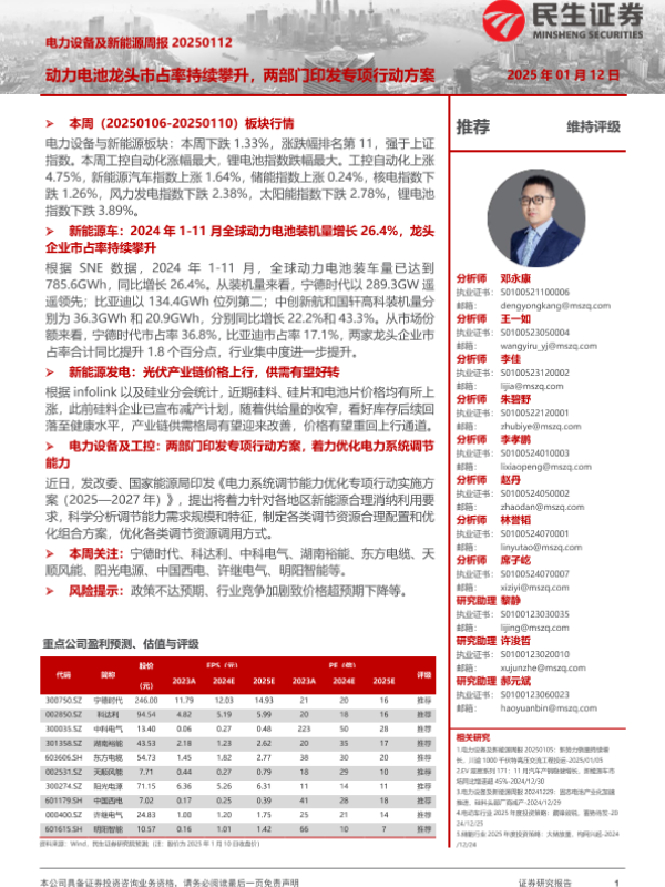 【民生证券】【20250112】电力设备及新能源周报:动力电池龙头市占率持续攀升,两部门印发专项行动方案-21页