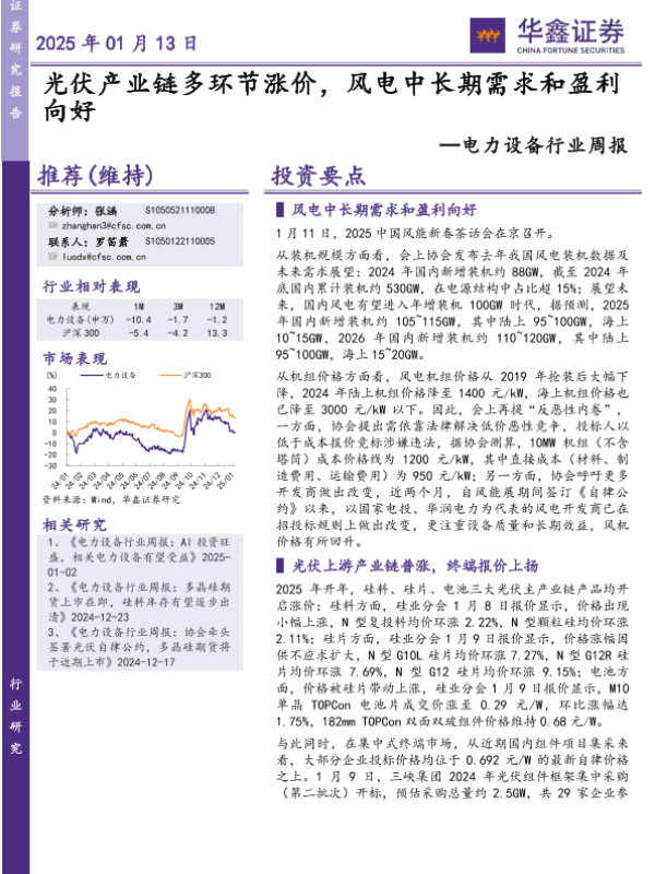 【华鑫证券】【20250113】电力设备行业周报:光伏产业链多环节涨价,风电中长期需求和盈利向好-16页