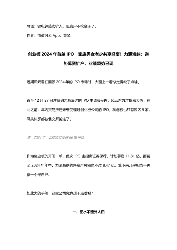 【市值风云】【20250116】创业板2024年首单IPO,家族男女老少共享盛宴!力源海纳:逆势募资扩产,业绩颓势已现-17页