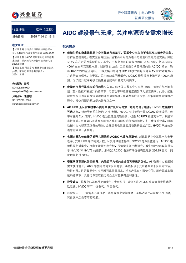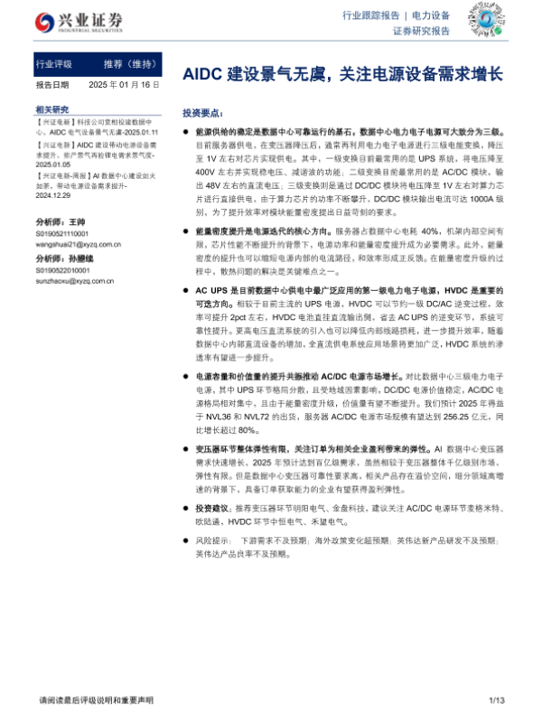 【兴业证券】【20250116】电力设备行业跟踪报告:AIDC建设景气无虞,关注电源设备需求增长-13页