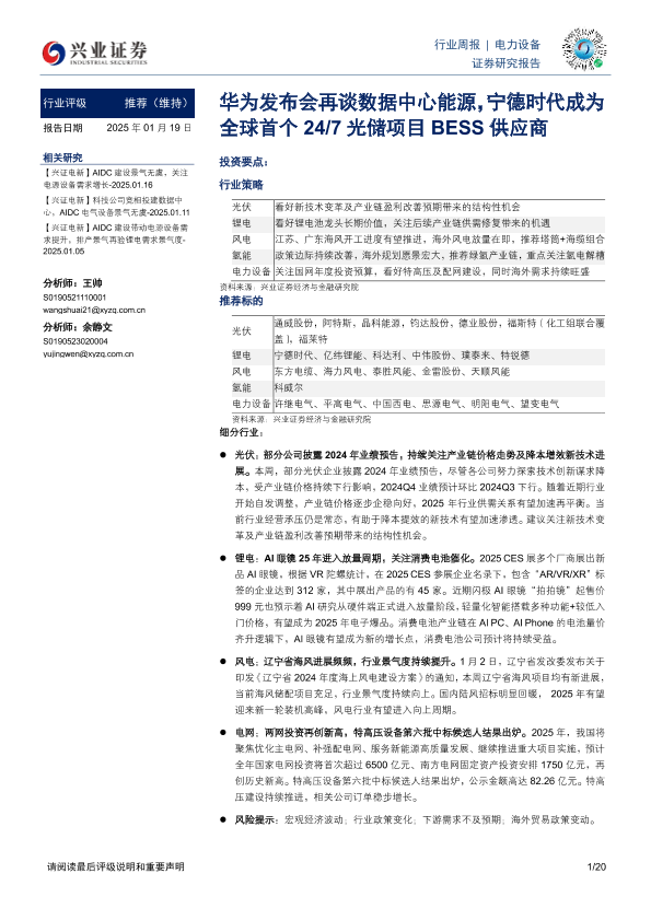 【兴业证券】【20250119】电力设备行业周报:华为发布会再谈数据中心能源,宁德时代成为全球首个24 7光储项目BESS供应商-20页