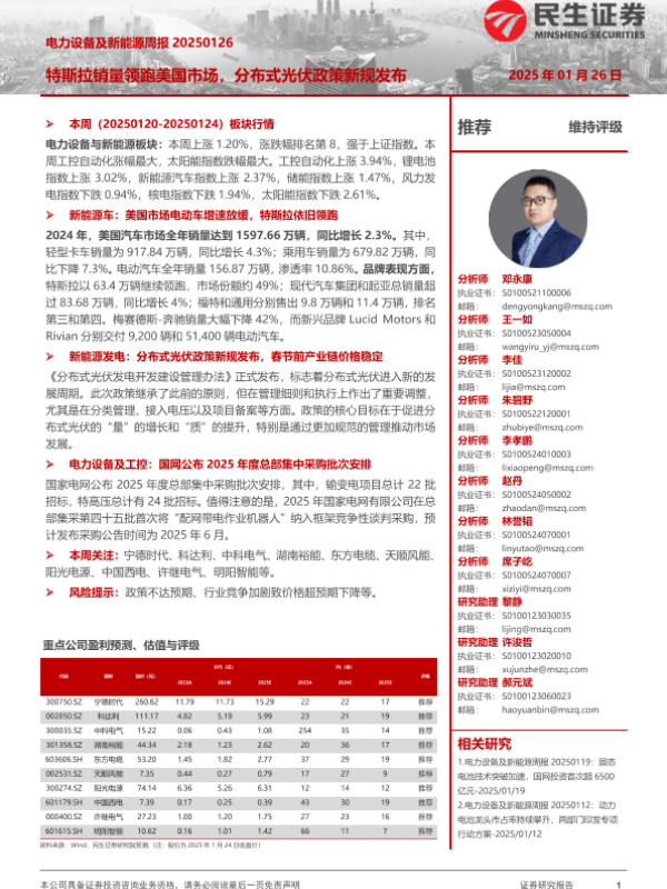 【民生证券】【20250126】20250126-民生证券-电力设备及新能源周报:特斯拉销量领跑美国市场,分布式光伏政策新规发布-24页