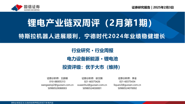 【国信证券】【20250203】锂电产业链双周评(2月第1期):特斯拉机器人进展顺利,宁德时代2024年业绩稳健增长-21页