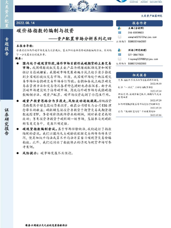 【国泰君安证券】【20220814】资产配置市场分析系列之四:碳价格指数的编制与投资-22页